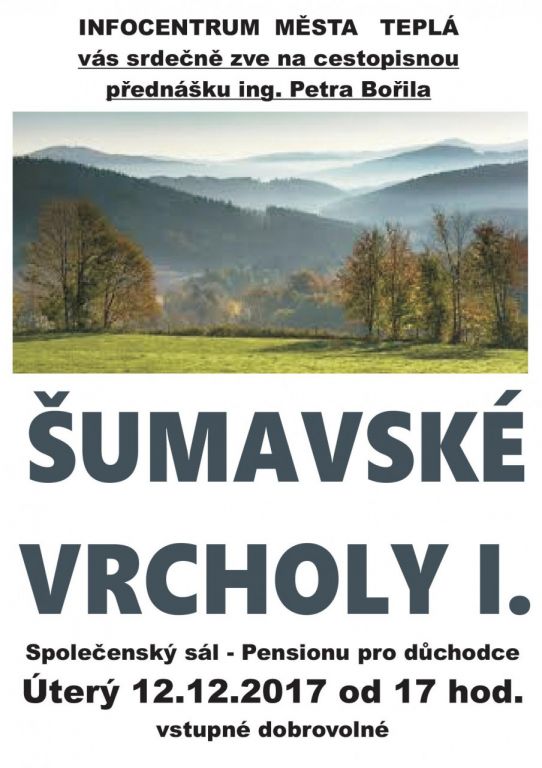 Přednáška ing. Petra Bořila ZA ŠUMAVSKÝMI VRCHOLY I., pension pro důchodce Teplá, 12.12.2017