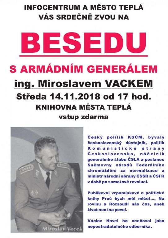 Beseda s armádním generálem ing. Miroslavem Vackem, středa 14.11.2018. knihovna města Teplá