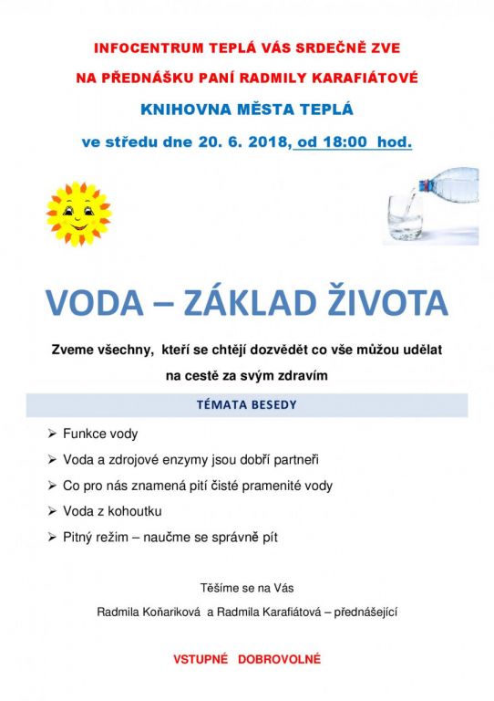 Přednáška ing. Karafiátové VODA - ZÁKLAD ŽIVOTA, knihovna města Teplá, 20.6.2018