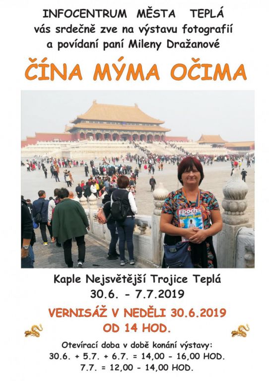 Výstava fotografií a povídaní paní Mileny Dražanové ČÍNA MÝMA OČIMA, Kaple Nejsvětější Trojice Teplá, vernisáž v neděli 30.6.2019